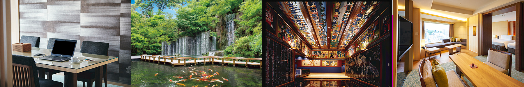結婚式場として利用されることも多いガーデンホテル紫雲閣は、水と緑に囲まれた見事な庭園をもつホテルです。1300年の歴史を誇る箭弓稲荷神社にも隣接しており、心安らぐ穏やかな空気を感じることができます。清潔感のあるお部屋でテレワークももちろん可能ですが、開放感のあるテラスやロビーを利用する方法もおすすめです。そよぐ風と竹林を感じながらリフレッシュすると、集中力も高められるかもしれません。